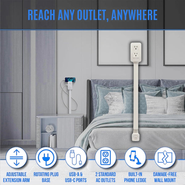 VoltReach⹠justeras för att enkelt nÄ uttag bakom soffor, sÀngar och skrivbord, utan att behöva flytta möbler.